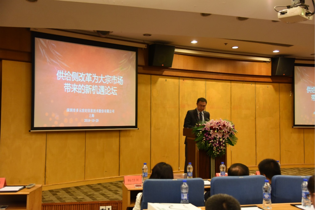 就是在这样行业发展背景下,2016年10月29日,由深圳市多元世纪信息技术股份有限公司主办,上海普三金融、新湖期货有限公司、上海石油化工交易中心、嘉兴中国华凝交易市场、杭州真数科技有限公司、中渝国际酒业交易中心协办的“供给侧改革为大宗市场带来的新机遇”在上海通茂大酒店举行。会议邀请了行业专家和银行、期货公司、大宗交易中心的领导作为嘉宾,针对在当前供给侧改革的大形势下,大宗市场应如何实现期现结合,向现货回归,加大创新发展力度去提升服务实体企业的能力等方面进行了专题演讲。